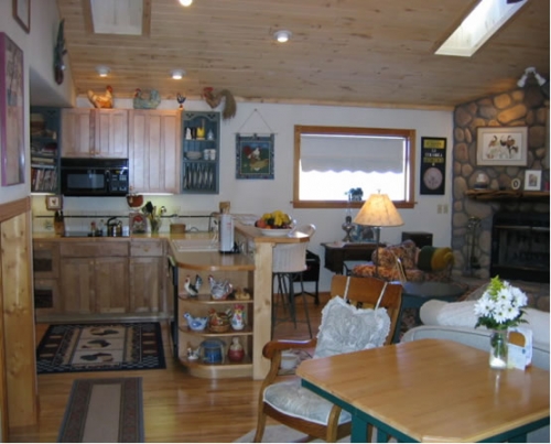 Cheerful characterizes the Crestone Room, by its queen size brass bed, see-thru stove, private bath with tub & hand-held shower.